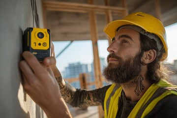 Man with long beard and mustache adjusting levels with tool, measurement using laser level on construction site. Concept of adjusting levels with tool in bright natural lighting.