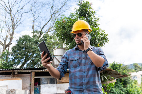 Male engineer standing on construction site multitasking with phone call and digital tablet. Latin American construction worker with safety gear using mobile devices at job site in rural area