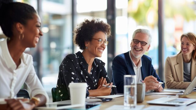 A diverse team collaborates enthusiastically, sharing ideas and discussing strategies in a contemporary corporate workspace
