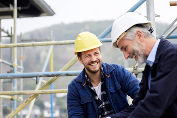 Caucasian males and Asian female builders, architector and engineers with draft plan of building and laptop computer talking on constructing site