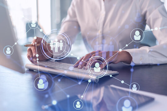 HR woman specialist is typing the keyboard in the internet to find the best candidates to create international network in recruitment process. Formal wear. Social media hologram icons.
