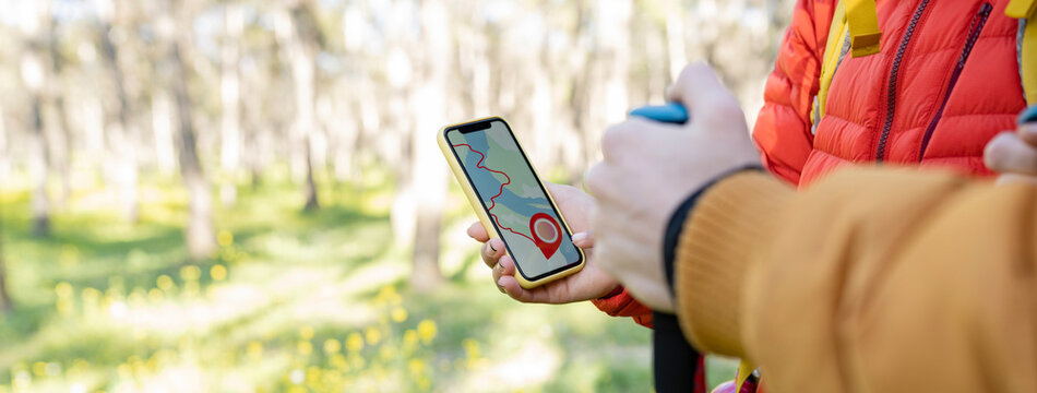 group of people in the forest consulting a map on a gps smartphone