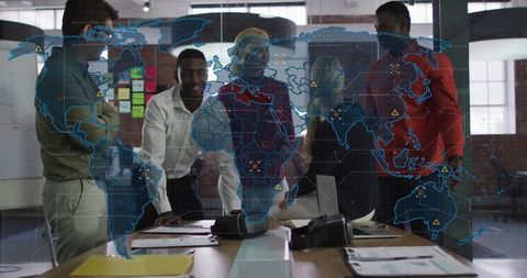 Multinational team collaborating over data with digital world map overlay and analytics
