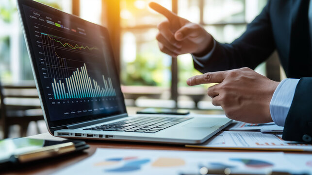 A close-up of hands pointing at financial charts on a laptop screen while discussing a new business proposal, with documents and a notepad on the table.
