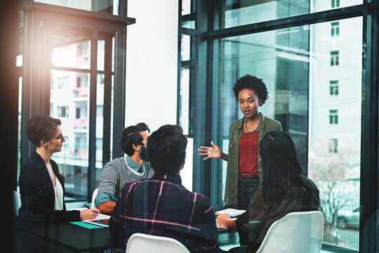 Meeting, communication and black woman with presentation in office for b2b merger, pitch and ideas. Employees, consulting and presenter with discussion for partnership, growth and business proposal