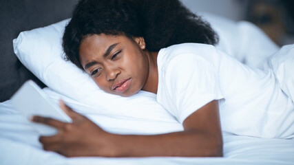 A young woman is lying on a bed, wearing a simple white t-shirt. She is looking at her smartphone with a confused expression. The background is soft and has neutral colors.
