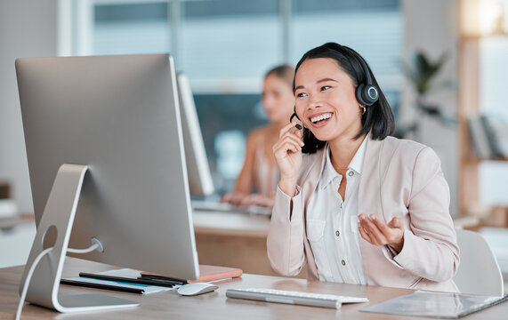 Asian woman, call center and computer in consultation for telemarketing, customer support or service at office desk. Happy female consultant smiling in contact us for desktop advice, help or sales