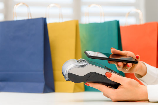 Woman using mobile phone to pay the biil with NFC technology