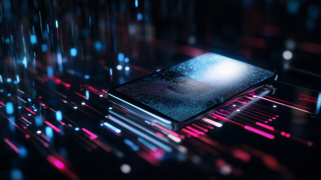 A holographic credit card projected from a sleek smartphone, surrounded by luminous data streams, symbolizing next-generation financial transactions.