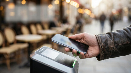 A person using a smartphone to make a contactless payment at a modern payment terminal in a busy outdoor cafe setting.
