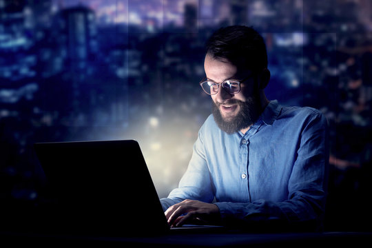 Young handsome businessman working late at night in the office with blue lights in the background