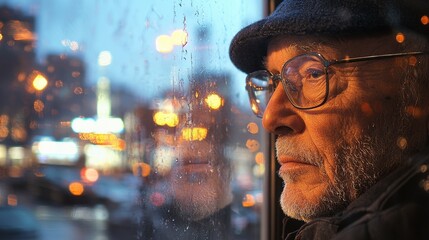 Reflective Senior Man Gazing at Rain-Soaked City from Window - Introspective Mood in Urban Setting