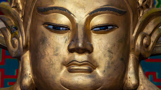 A bald monk in saffron robes meditates with a serene expression in the warm glow of golden hour light