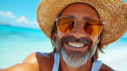 Smiling Bearded Man Wearing Straw Hat and Sunglasses at Beach