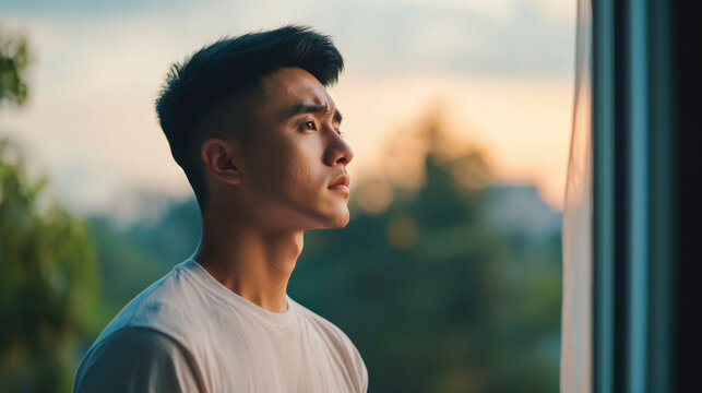 young man gazes thoughtfully out of window, reflecting on life. warm light of sunset creates serene atmosphere, highlighting his contemplative expression