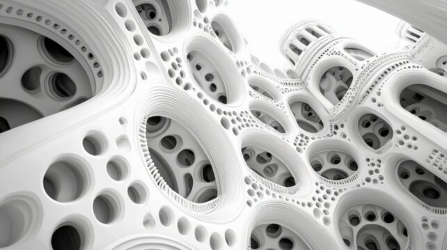 An abstract architectural structure with a complex design featuring numerous circular openings and a play of light and shadow.