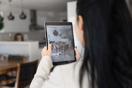 Young Beautiful Woman Using Tablet to Watch Videos on Online Streaming Service. Creative Female Checking Social Media, Browsing Internet, Consuming Content. Urban City View from Big Window.