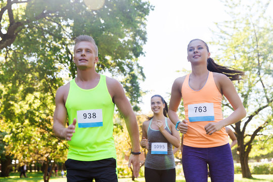 fitness, sport and success concept - happy woman winning race and coming first to finish red ribbon over group of sportsmen running marathon with badge numbers at park