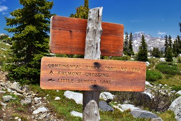 Continental Divide Trail sign in Wind Rivers Range Wyoming along Continental Divide Trail No. 094, Fremont Crossing, Seneca Lake, Lester Pass, Island Lake and Indian Lake which is part of the Rocky Mo