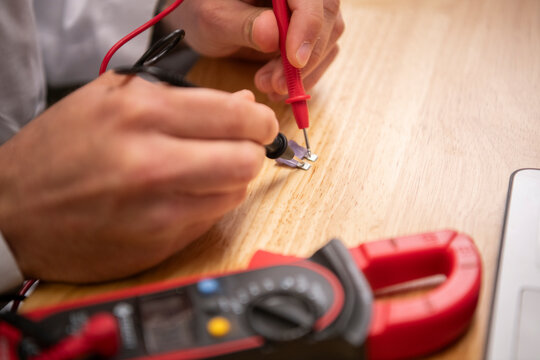 Electrician engineer adorned in safety gear is checks wire connections and continuity in an industrial electrical panel.