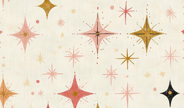 A dramatically small, symmetrical, repeating pattern on cream linen fabric, with pale pink and light orange pastel colors. Small, symmetrical patterns of little diamonds, stars, and crosses.