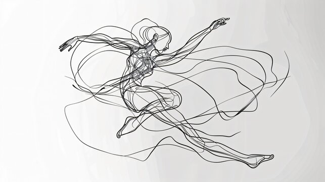 A minimalist black and white line drawing of a dancer in motion, with fluid lines capturing the grace and dynamism of the movement