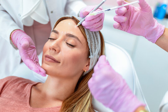 Cosmetologist drawing contour lines on the female's face before brow lifting and botox. Aesthetic beauty anti aging, face lifting surgery