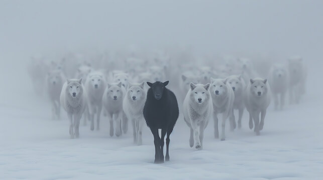 Black sheep leading a group of white wolves through a dense fog, showcasing leadership and divergence, Black sheep, White wolves, Leadership and divergence