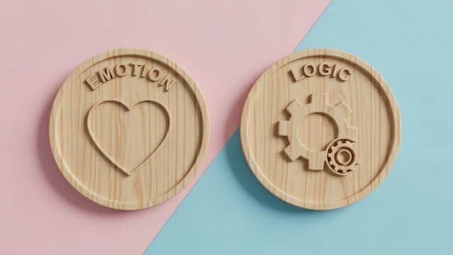 Symbolic wooden discs representing emotion and logic, contrasting abstract concepts.