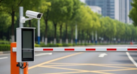 A modern automatic barrier gate with a surveillance camera system is closed, blocking access to a paved road in a contemporary urban area with lush green trees