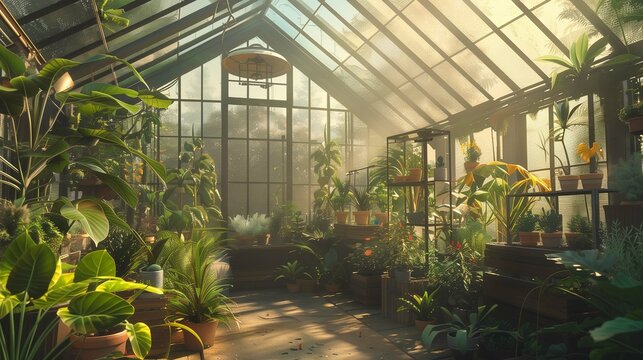 Lush greenhouse filled with rows of healthy plants growing under controlled conditions for agriculture and gardening