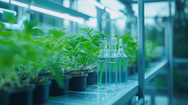 Young plants thrive in lab beakers, a vibrant green life nurtured under controlled conditions.  A testament to scientific growth.