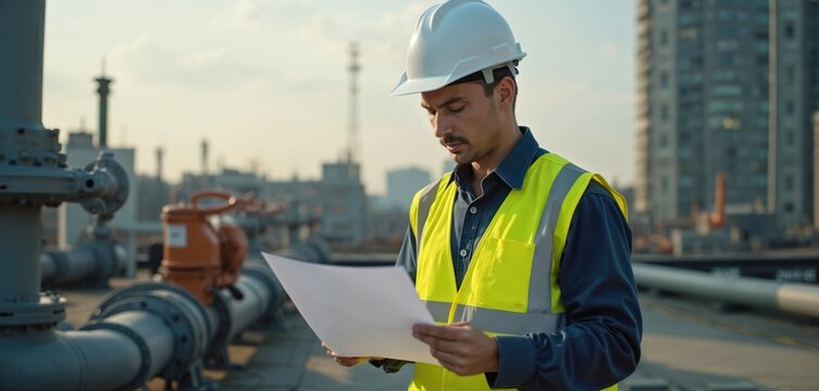 Engineer wearing white helmet checks blueprints at industrial site outdoors. Man in vest inspects pipes valves. Construction worker reviews plans. Pro controls quality building operations on rooftop.
