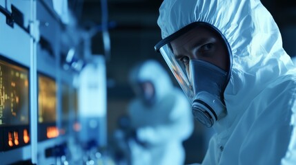 An industrial factory worker attentively monitors various controls and gauges in a manufacturing facility. The setting features multiple screens displaying important data