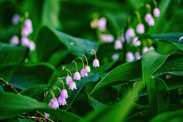 Blooming convallaria rosea majalis among green leaves. spring garden plant close up