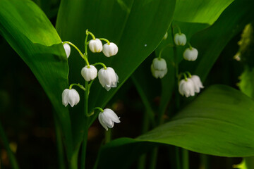 Green leaves and white flowers of Convallaria majalis in May