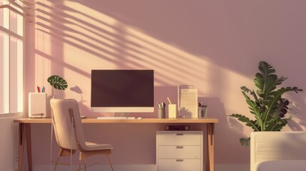 Modern home office setup in living room with minimalist interior design, cozy and convenient workspace for remote work, featuring comfortable furniture and natural light background