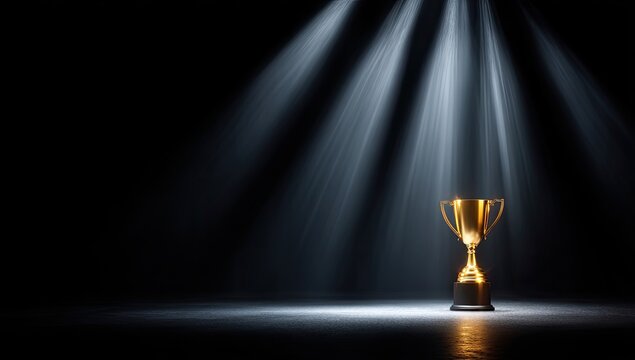 A gleaming gold trophy sits center stage, dramatically lit by converging spotlights against a stark black background, reflecting subtly on the dark floor