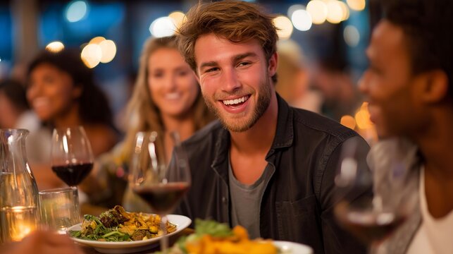 At a bustling restaurant, a social gathering brings together colleagues and friends, engaging in animated conversations over delicious food and drinks, fostering connections and laughter in a