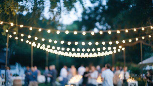 A lively outdoor evening gathering with twinkling string lights illuminating the scene, conveying a warm and festive atmosphere.