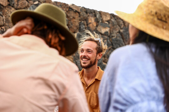 Diverse friends enjoying wine and conversation at outdoor gathering