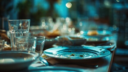 A Lively Dining Experience Captured in the Aftermath of a Dinner Table Filled with Used Plates, Glasses, and Remnants of Food