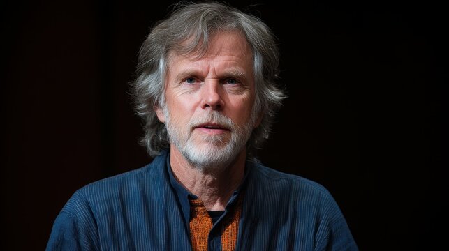 A man with silver hair and a beard stands on stage, wearing a blue shirt with orange detailing. He engages the audience during a lively discussion in a dimly lit venue