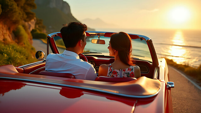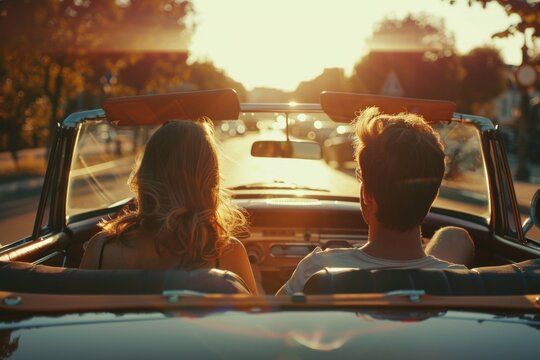 A couple sitting in the back of a convertible car. Ideal for travel and leisure concepts