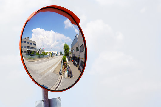 Close up traffic convex mirror, road safety concept