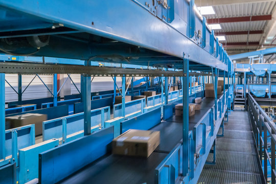 Parcels on conveyors with blurred industrial background