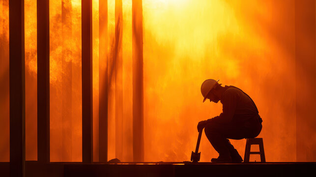 Silhouette of construction worker hard hat, sitting stool, surrounded by dramatic orange glow from smoke and light. scene conveys sense of hard