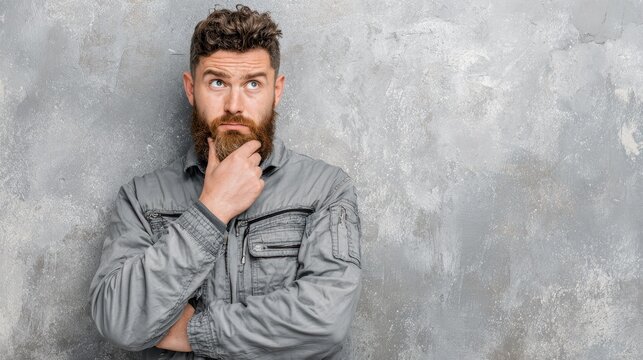 Confused Technician. Young Caucasian Man in Mechanic Uniform Against Grey Grunge Wall, Expressing Seriousness and Confusion