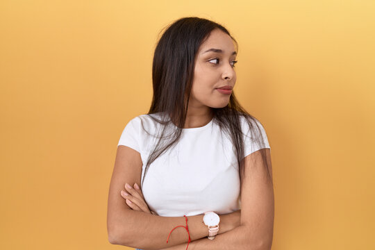 Young arab woman wearing casual white t shirt over yellow background looking to the side with arms crossed convinced and confident