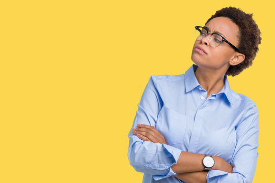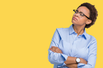 Young beautiful african american woman wearing glasses over isolated background smiling looking to the side with arms crossed convinced and confident